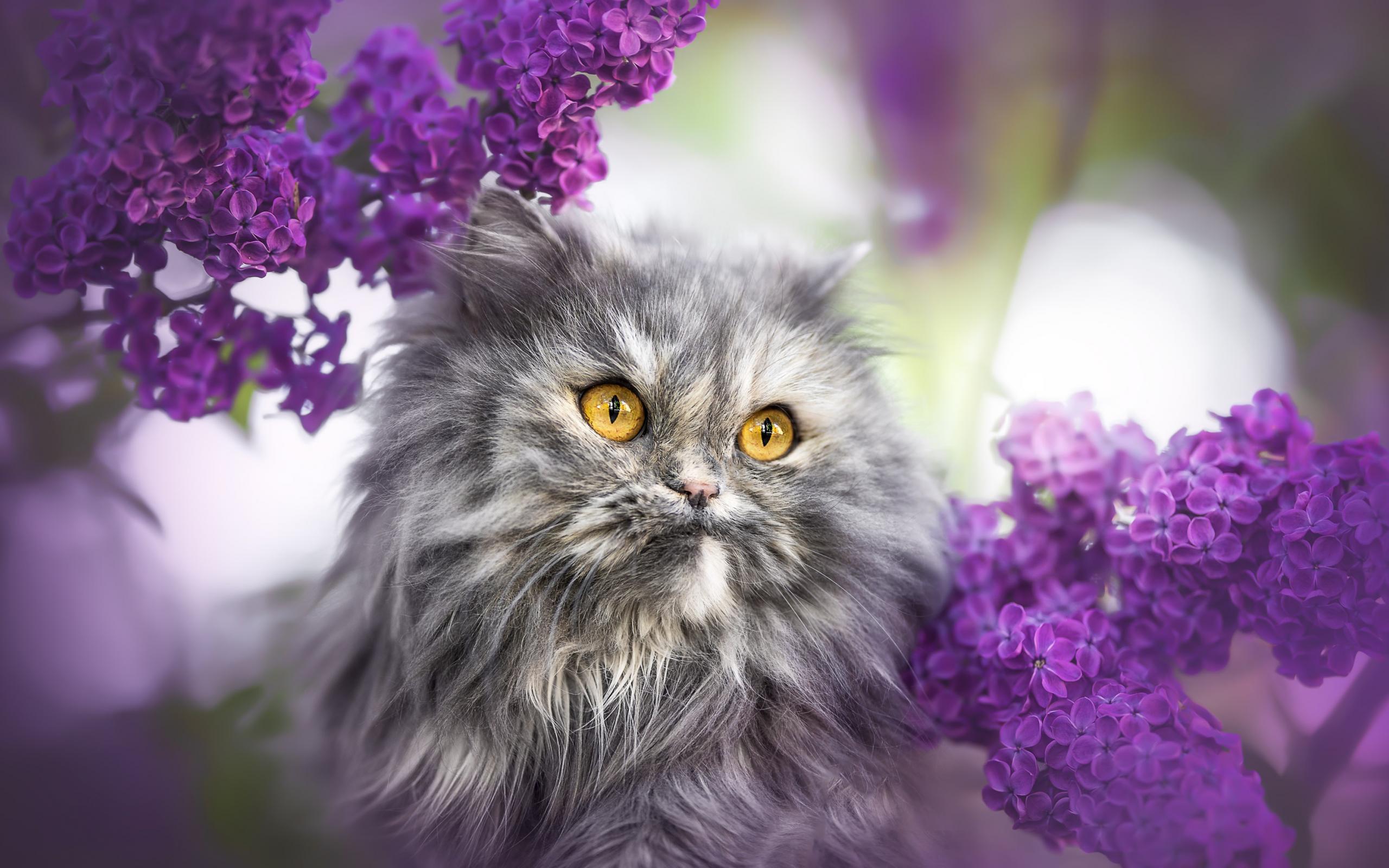 Обои Пушистый серый кот с желтыми глазами в цветах сирени