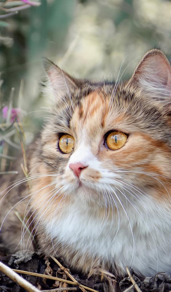 Обои Пустая испуганная кошка сидит в траве с розовыми цветами