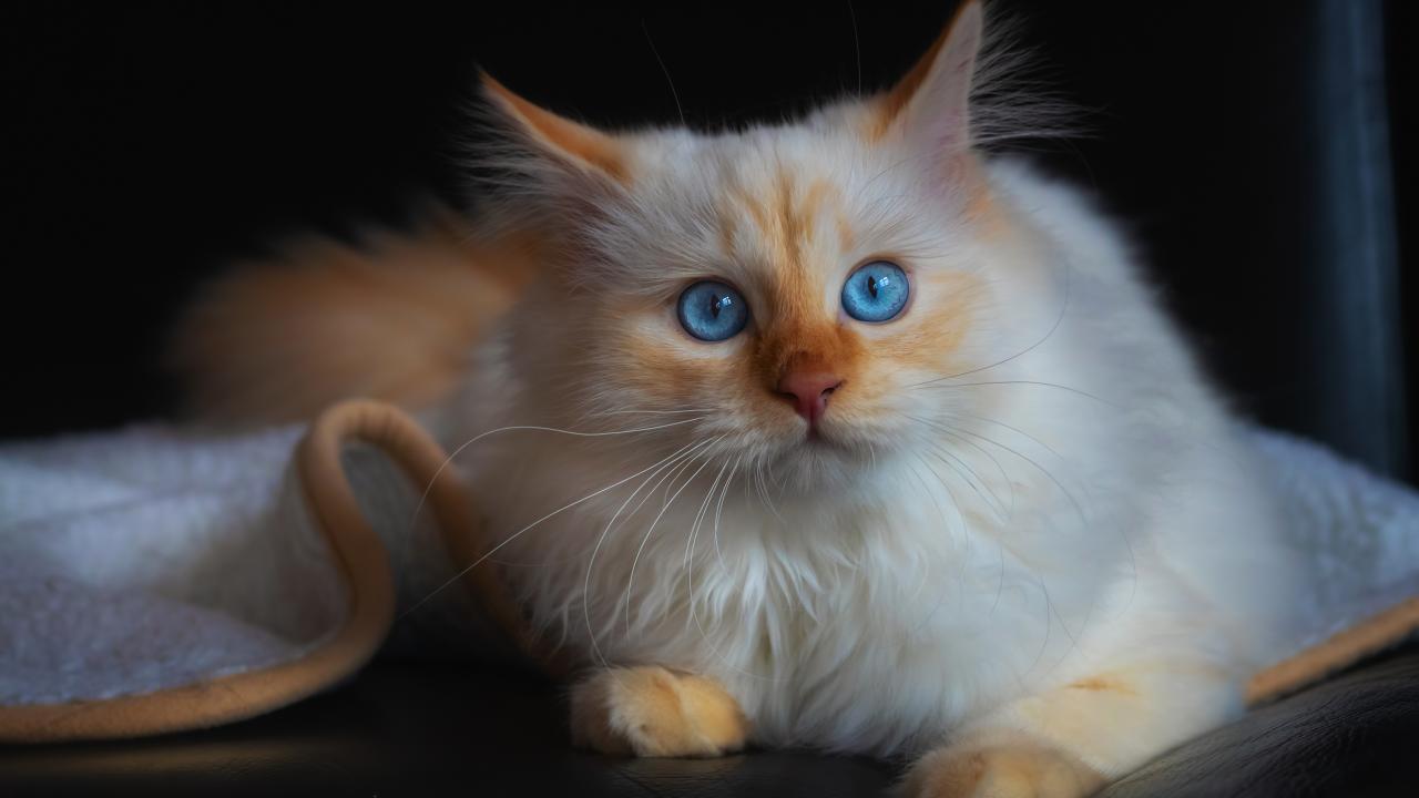 Обои Красивый породистый голубоглазый кот лежит на диване
