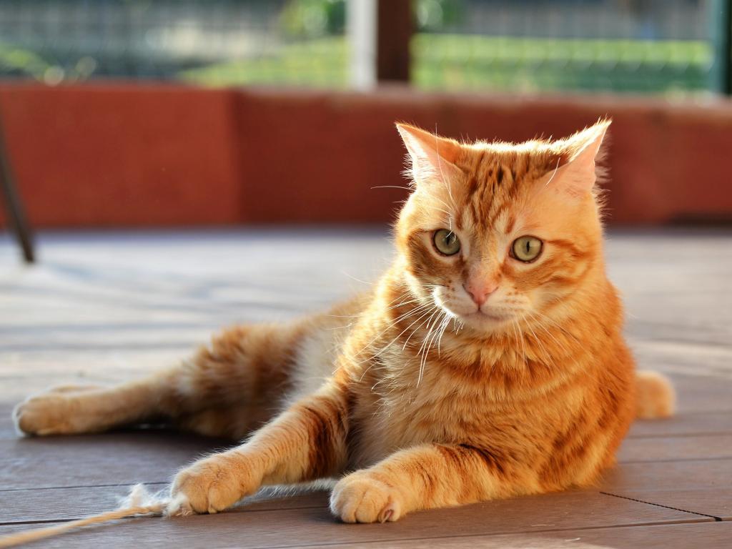 Обои Удивленный серый кот лежит на деревянном полу