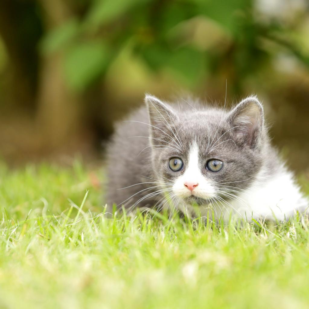 Обои Маленький котенок лежит на зеленой траве