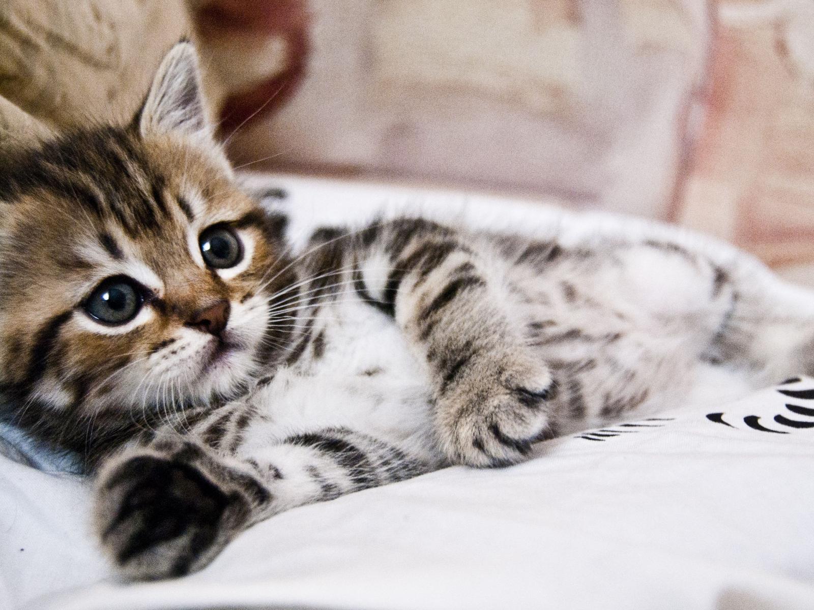 Обои Маленький милый серый полосатый котенок лежит на кровати