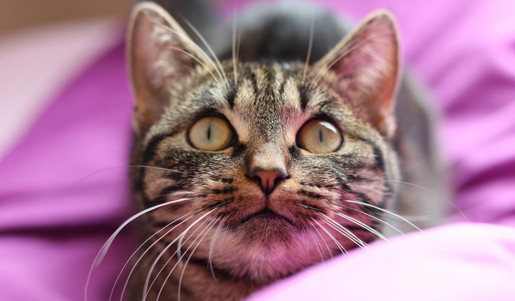 Обои Полосатый серый кот лежит на розовом покрывале