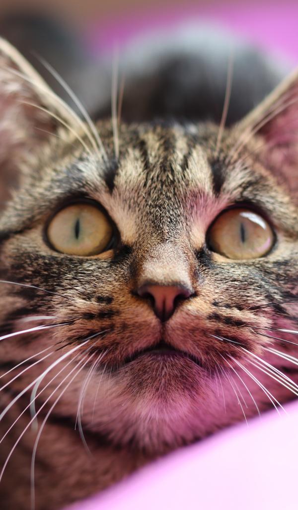 Обои Полосатый серый кот лежит на розовом покрывале