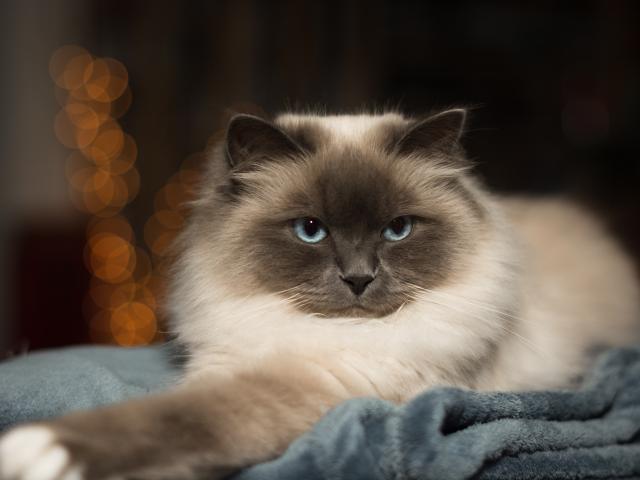 Обои Породистый пушистый голубоглазый кот лежит на кровати