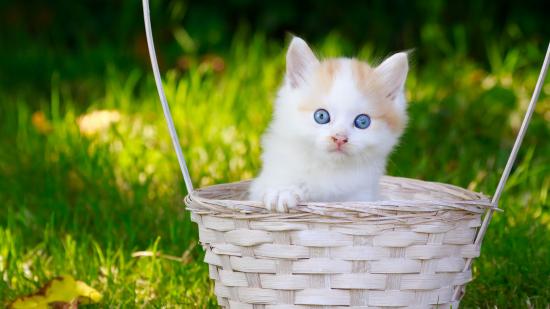 Обои Маленький котенок в корзине на зеленой траве
