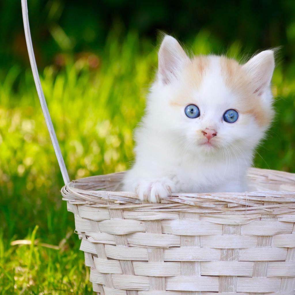 Обои Маленький котенок в корзине на зеленой траве