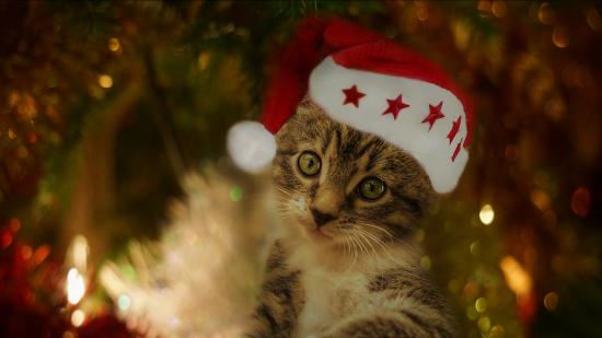 Обои Забавный серый котенок в красной шапке под елкой