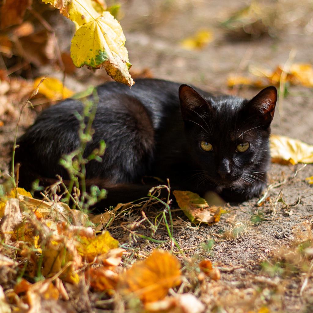 Обои Черный кот лежит на земле с опавшими листьями