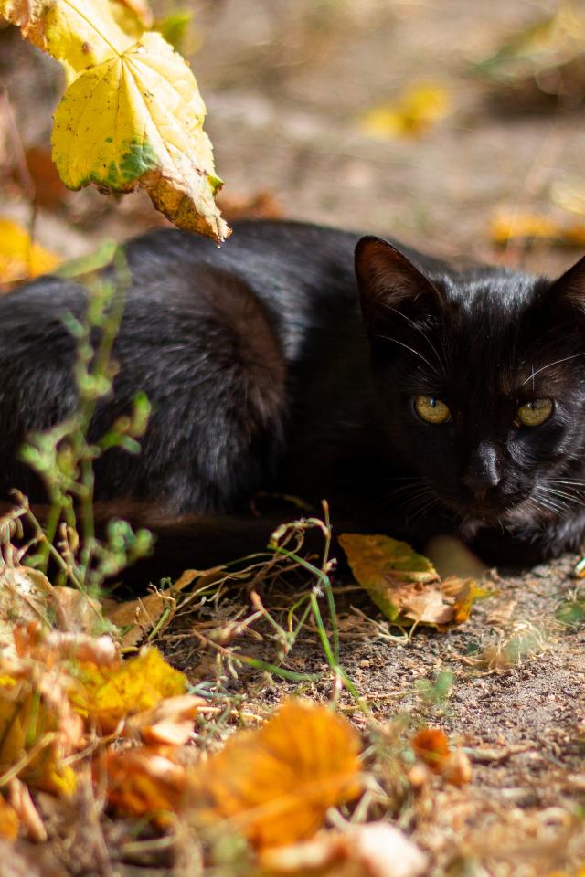 Обои Черный кот лежит на земле с опавшими листьями
