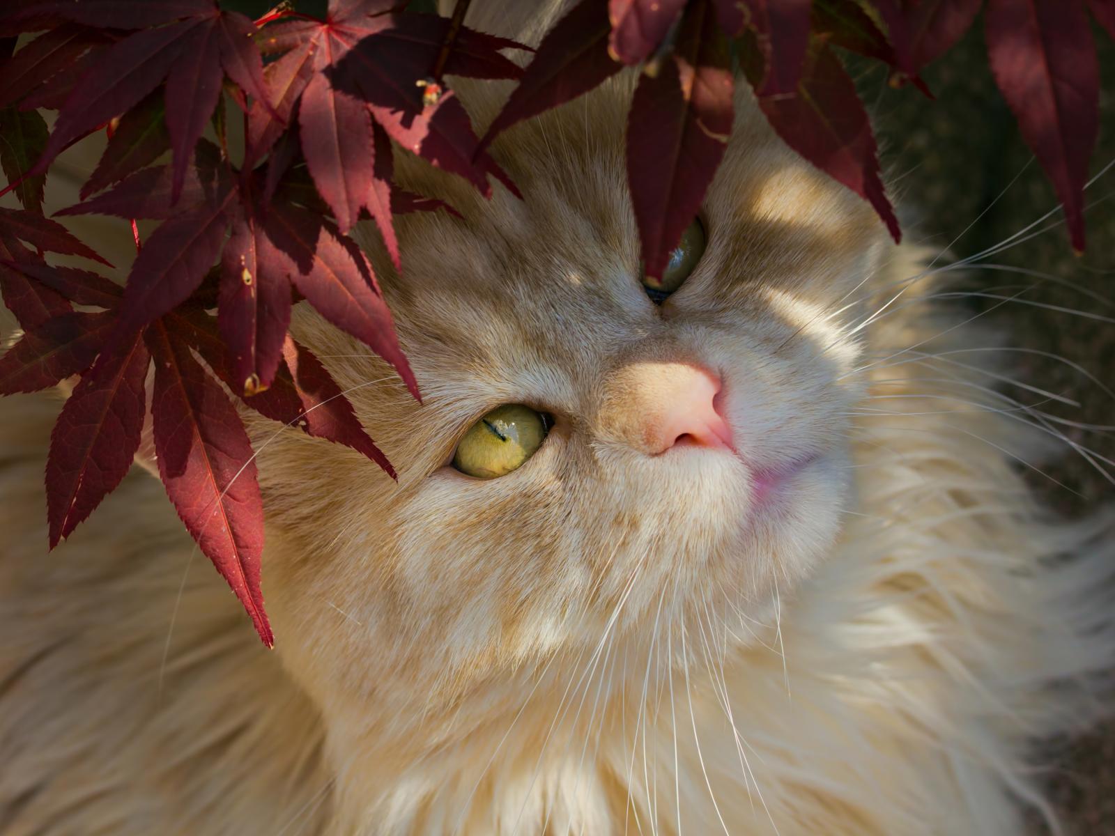 Обои Рыжий кот с желтыми глазами в красных листьях