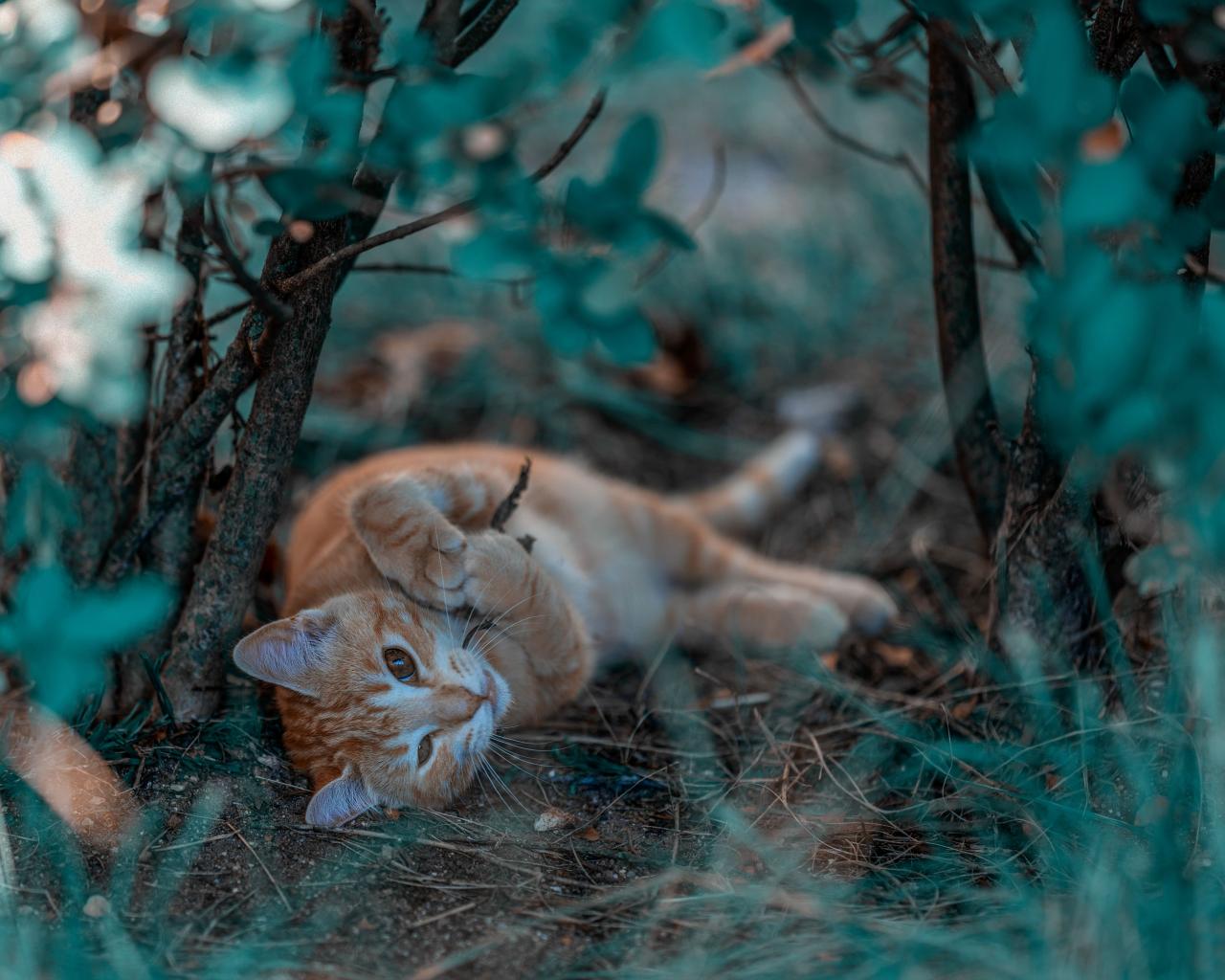 Обои Рыжий любопытный котенок сидит в зеленых ветках