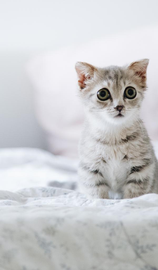 Обои Маленький испуганный котенок сидит на кровати