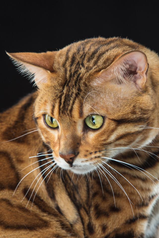 Обои Красивая пятнистая бенгальская кошка на черном фоне