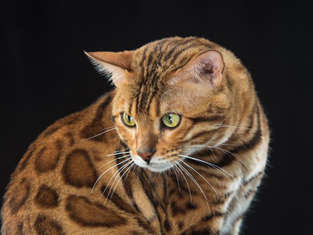 Обои Красивая пятнистая бенгальская кошка на черном фоне
