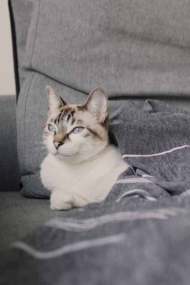 Обои Красивая голубоглазая кошка лежит под одеялом