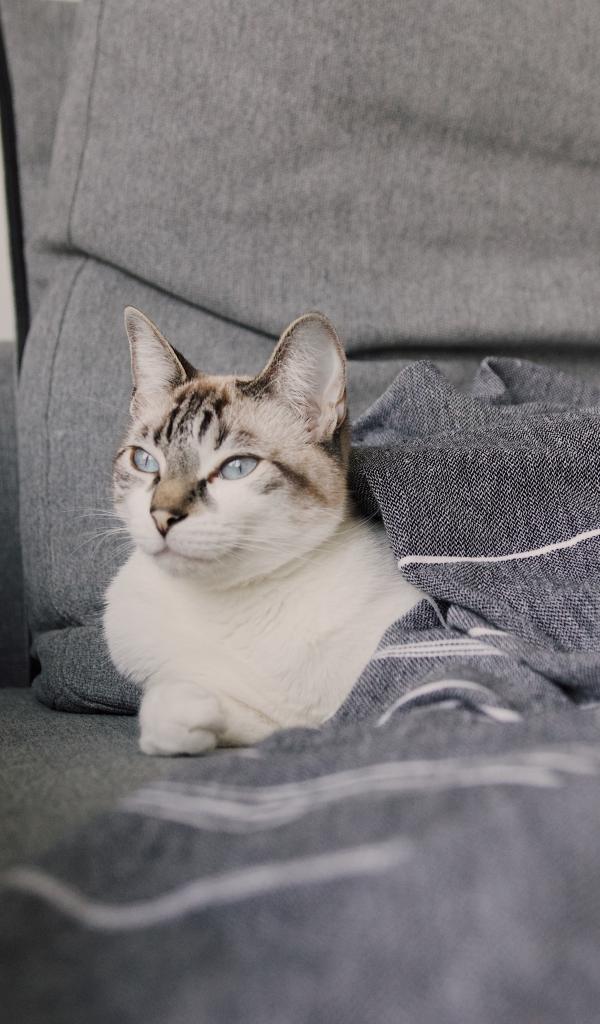 Обои Красивая голубоглазая кошка лежит под одеялом