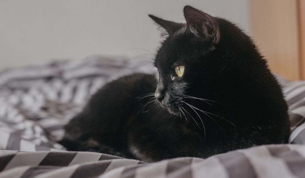 Обои Красивый черный кот лежит на кровати