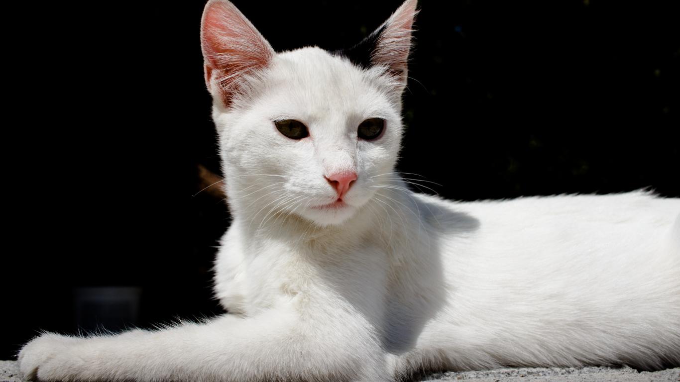 Обои Белый кот спит на камнях на черном фоне