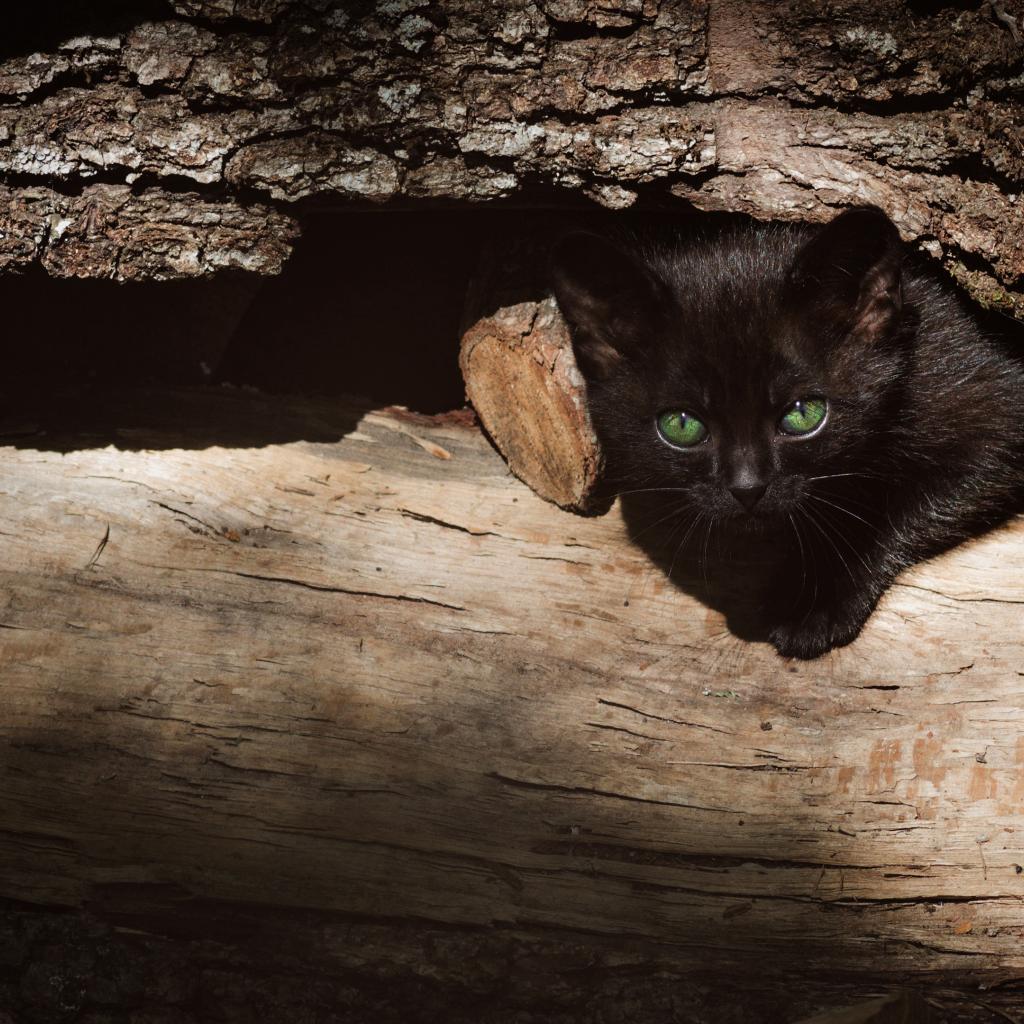 Обои Маленький черный котенок прячется в дровах