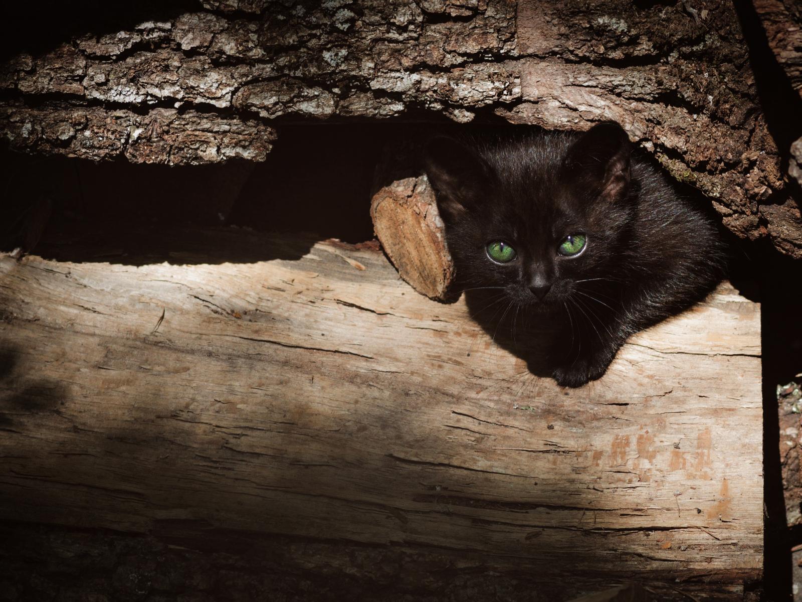 Обои Маленький черный котенок прячется в дровах
