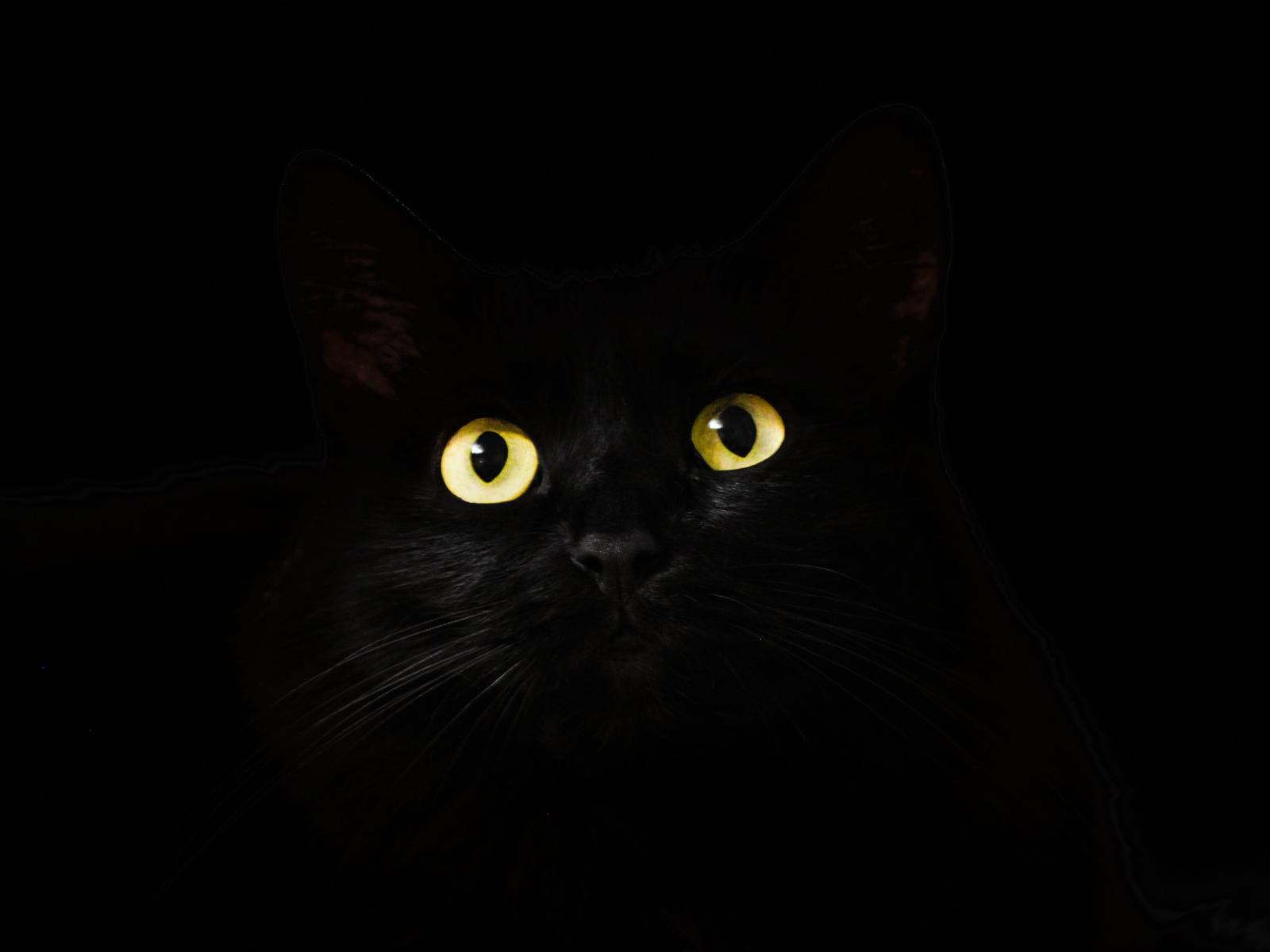 Обои Большие желтые глаза кошки на черном фоне