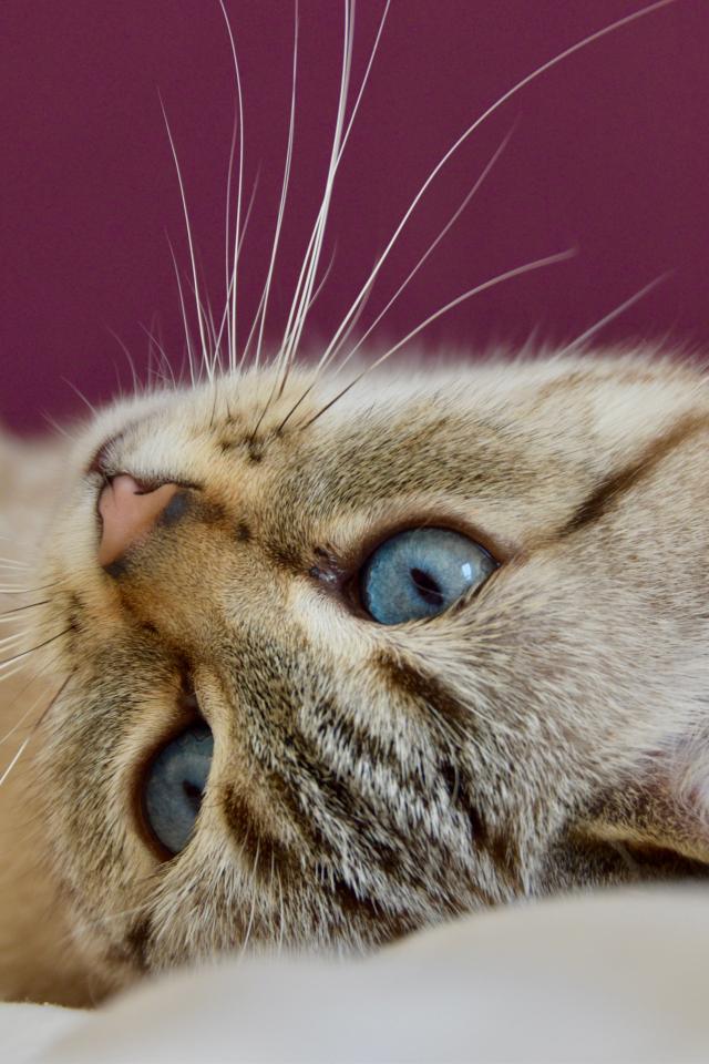 Обои Красивая голубоглазая кошка лежит на кровати