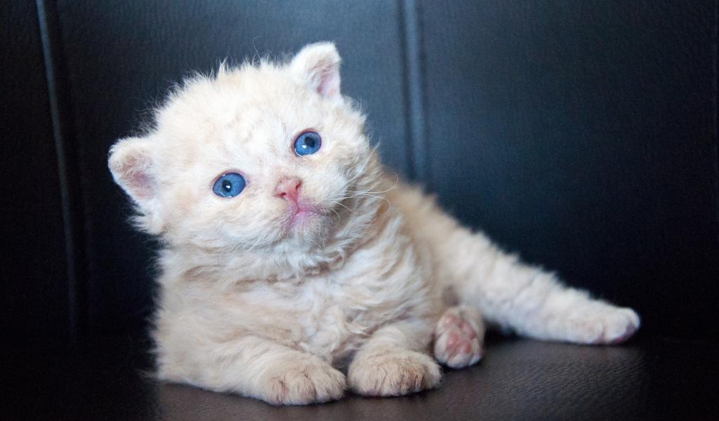 Обои Маленький голубоглазый котенок лежит на черном диване