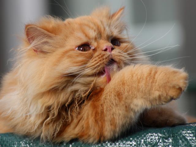 Обои Пушистый рыжий кот облизывает лапу