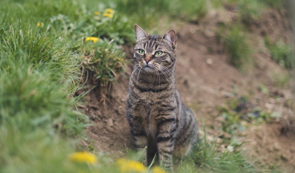 Обои Серый полосатый кот охотится в зеленой траве