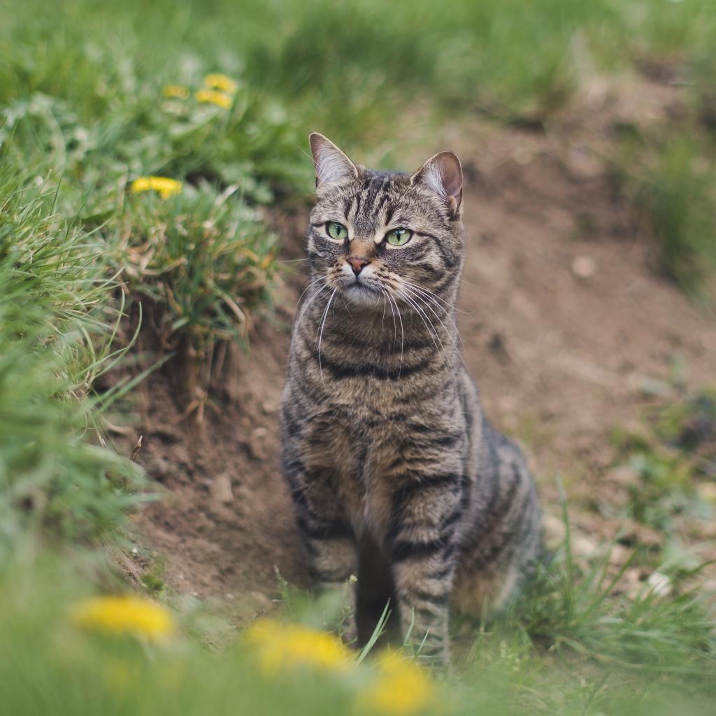 Обои Серый полосатый кот охотится в зеленой траве
