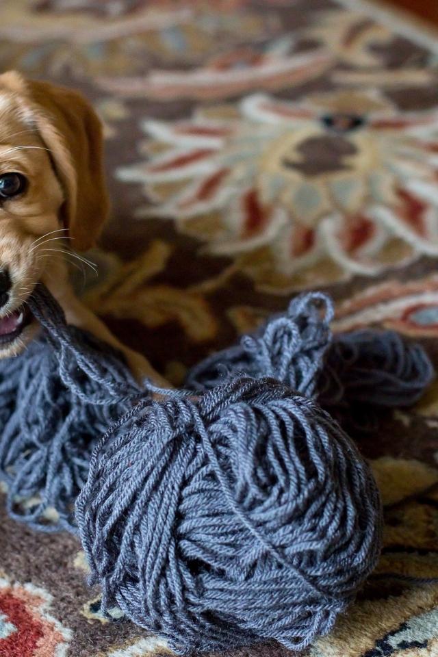 Обои Маленький щенок грызет нитки