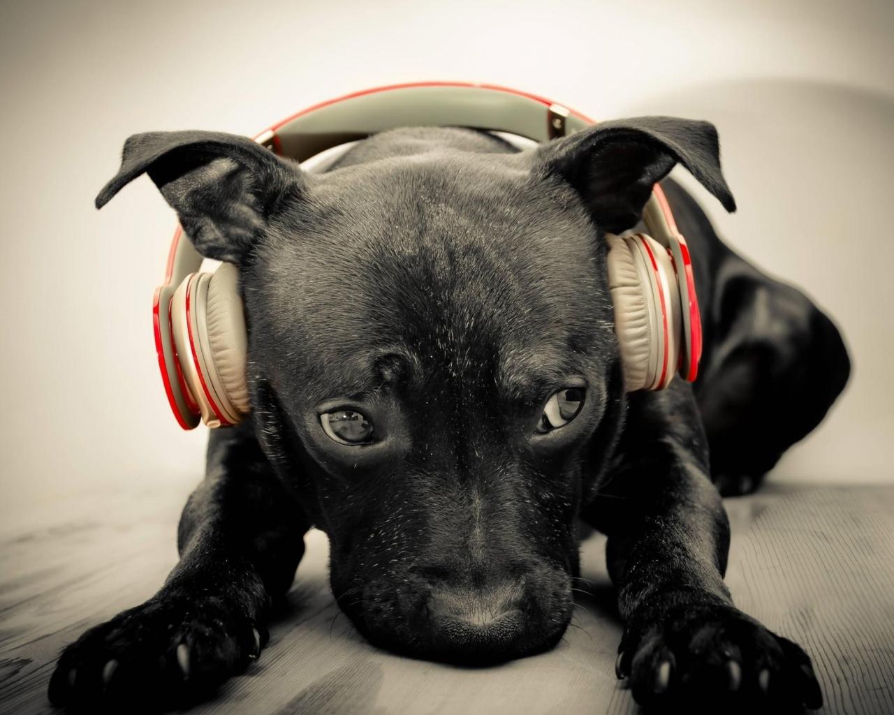 Обои Черный щенок в красных наушниках