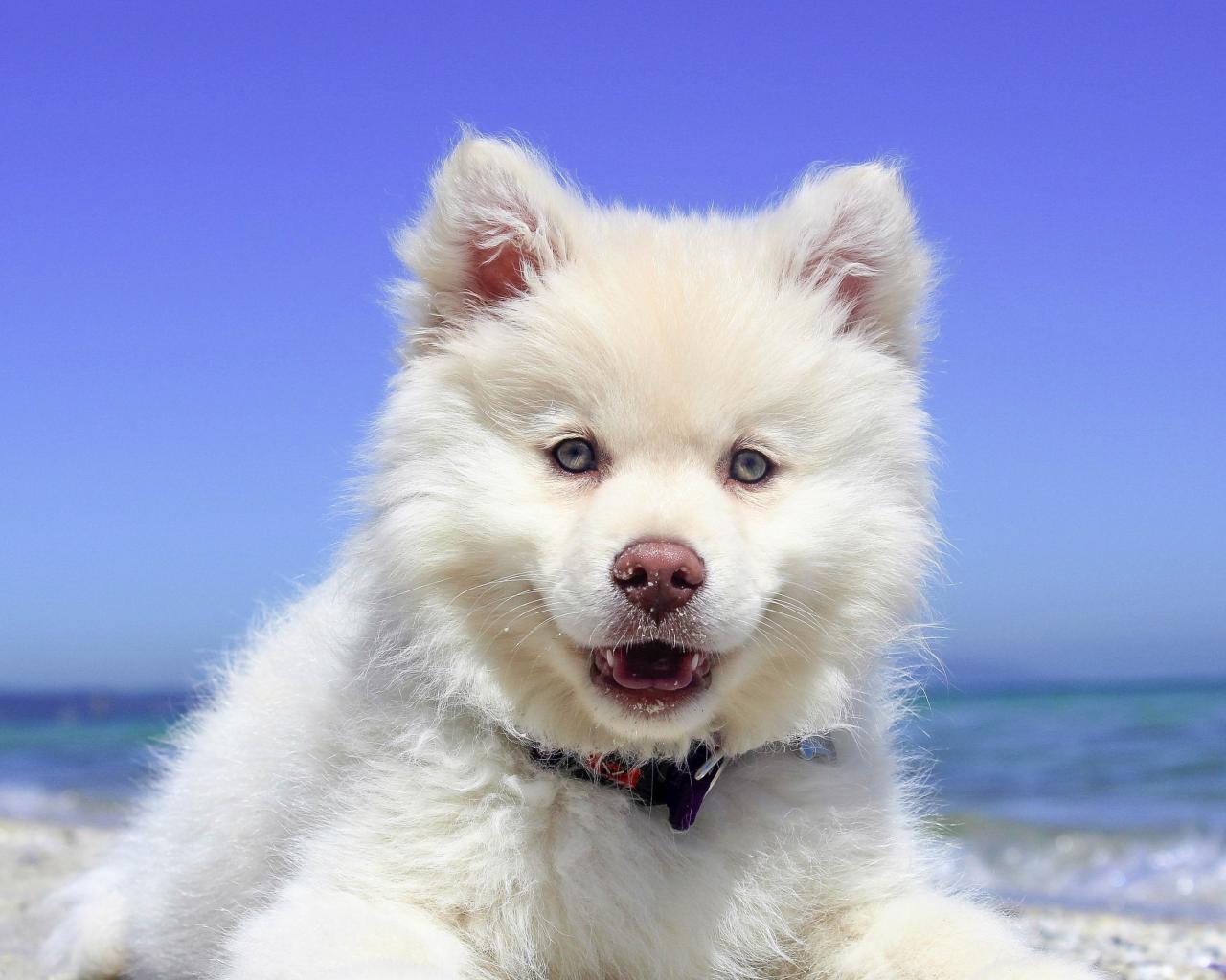 Обои Белый пушистый щенок с розовым носом на пляже