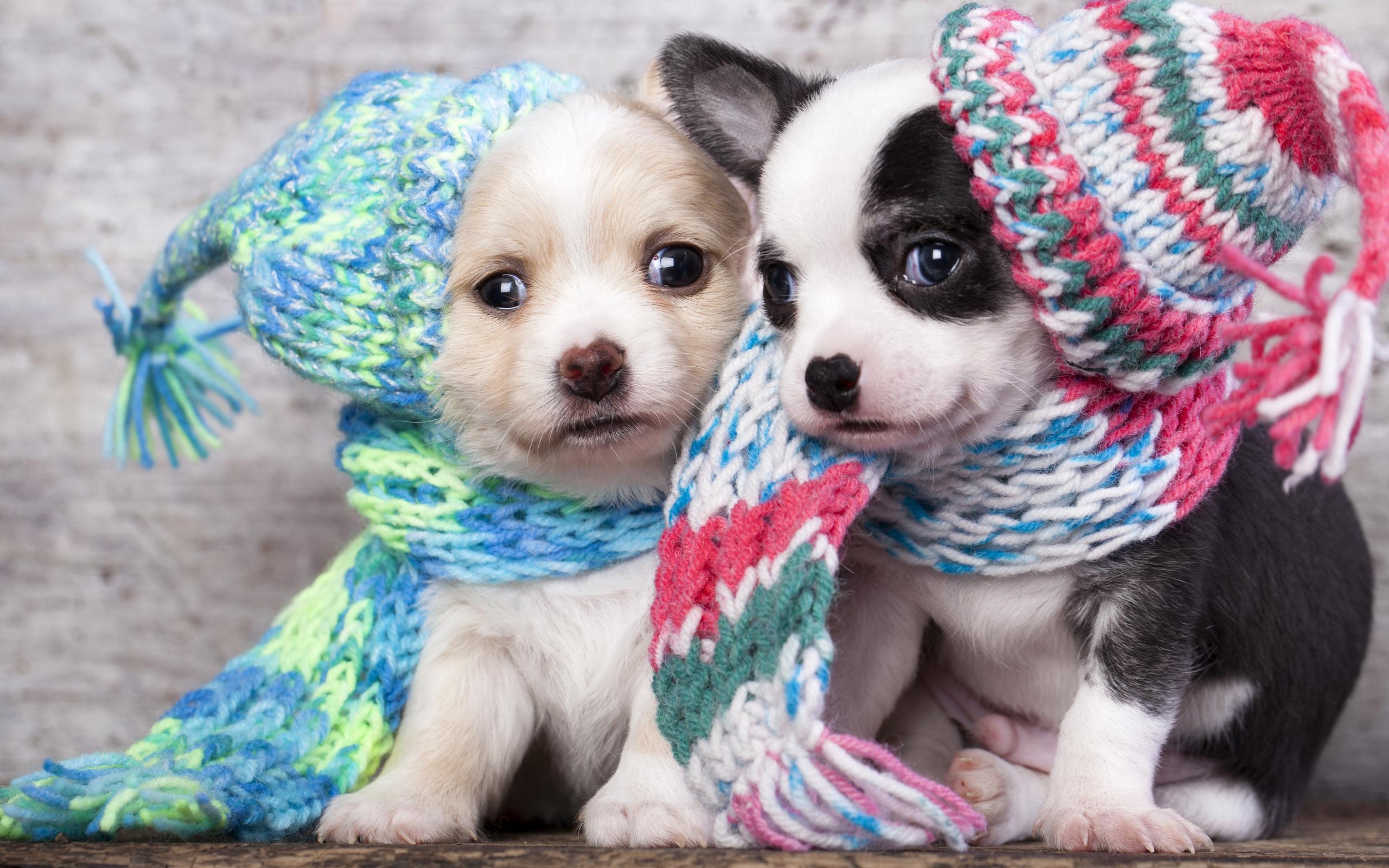 Обои Маленькие щенята в забавных вязаных шапках