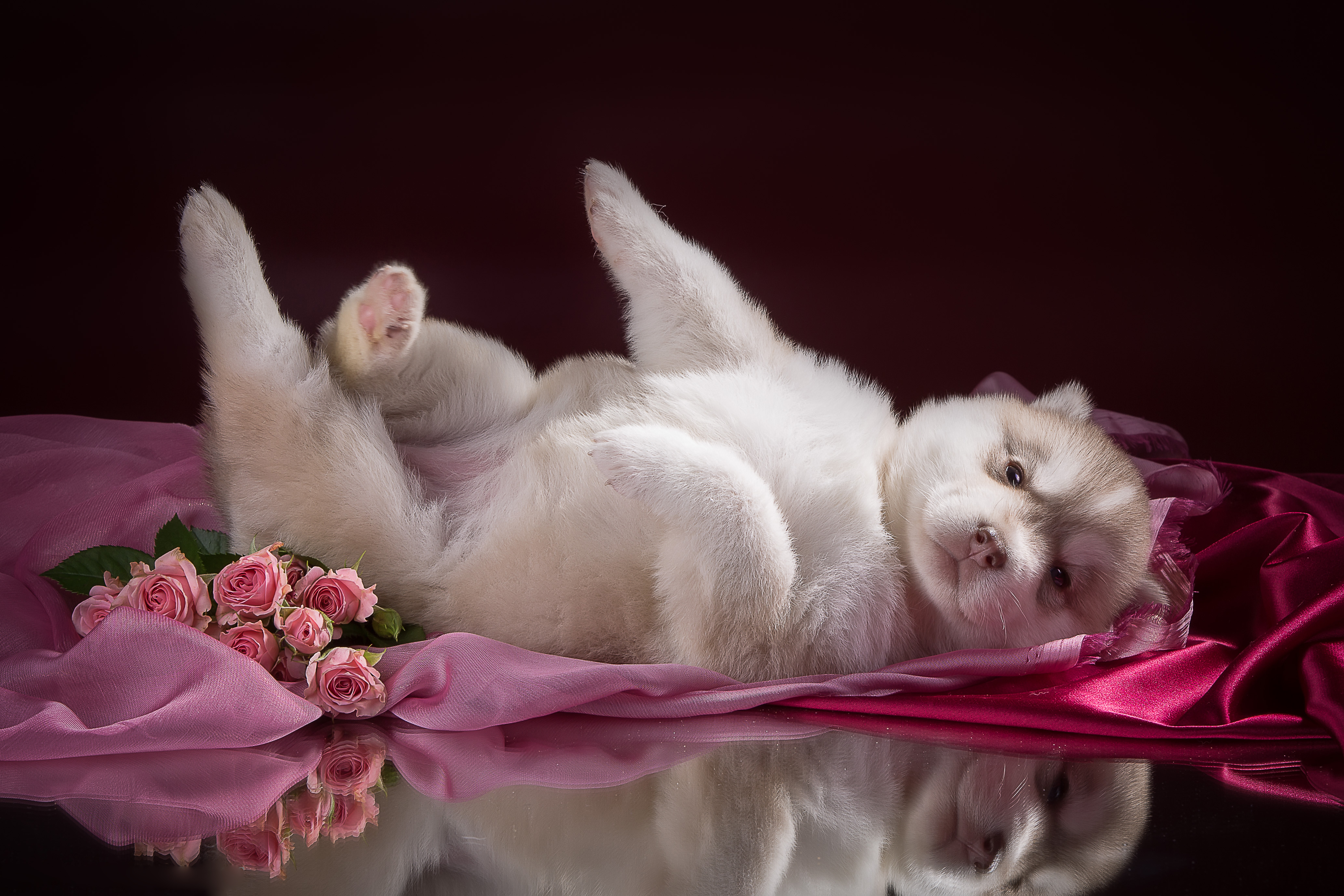Обои Маленький милый щенок хаски на розовом покрывале