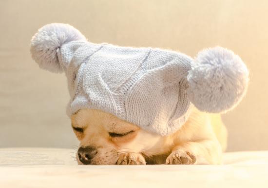Обои Собака породы чихуахуа спит в белой шапке