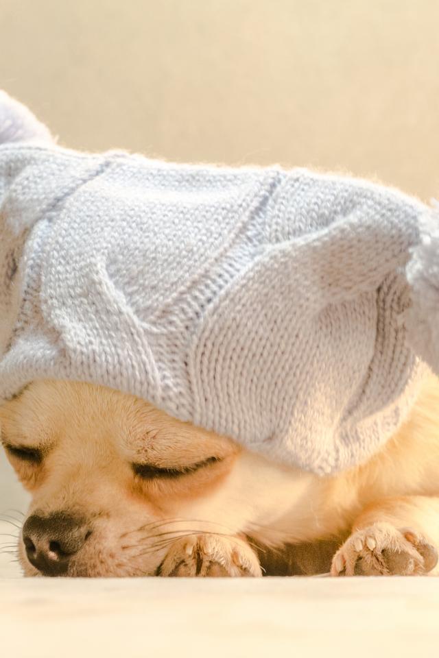 Обои Собака породы чихуахуа спит в белой шапке