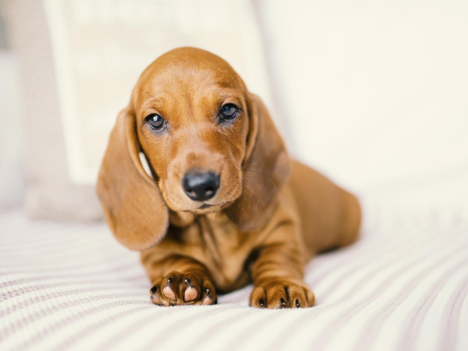 Обои Маленький забавный щенок таксы на белом фоне