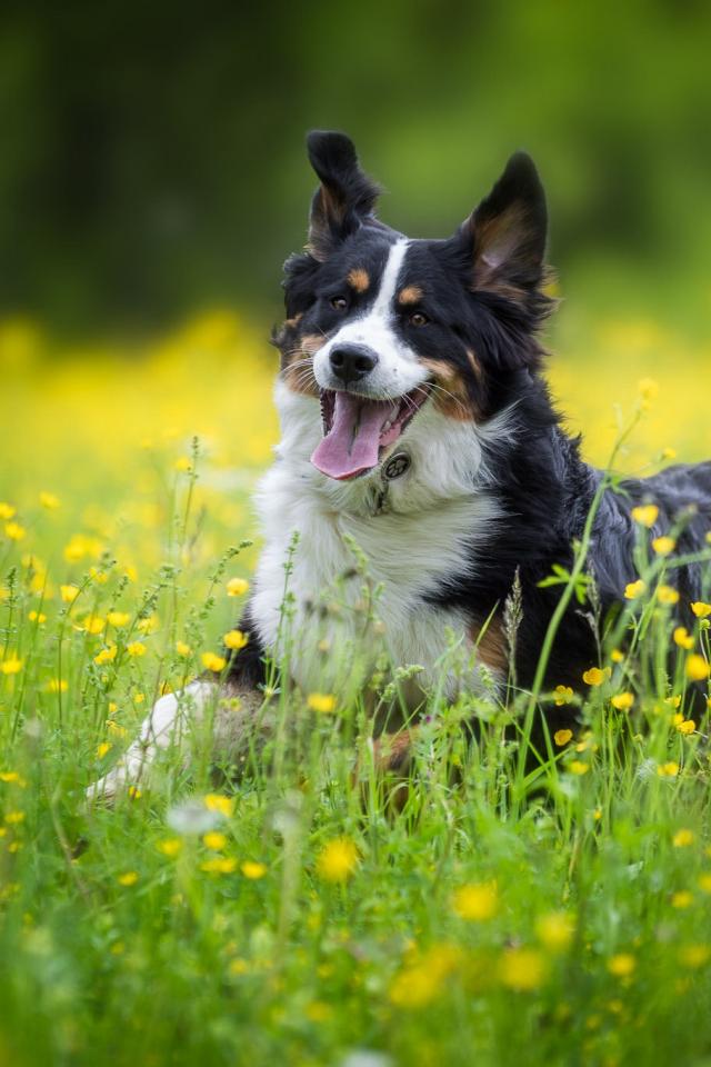 Обои Веселая собака породы английская овчарка в поле