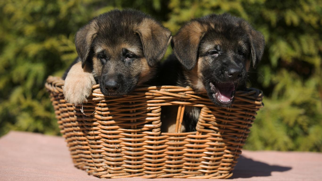 Обои Два щенка немецкой овчарки в плетеной корзине
