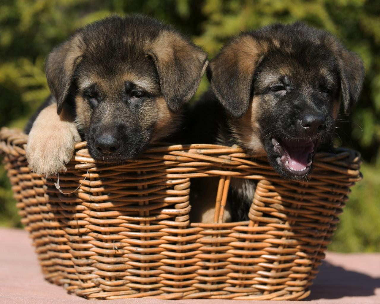 Обои Два щенка немецкой овчарки в плетеной корзине