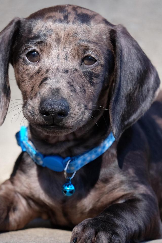 Обои Грустный щенок таксы с голубым ошейником