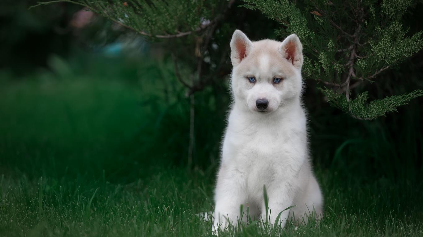 Обои Милый голубоглазый щенок хаски в зеленой траве