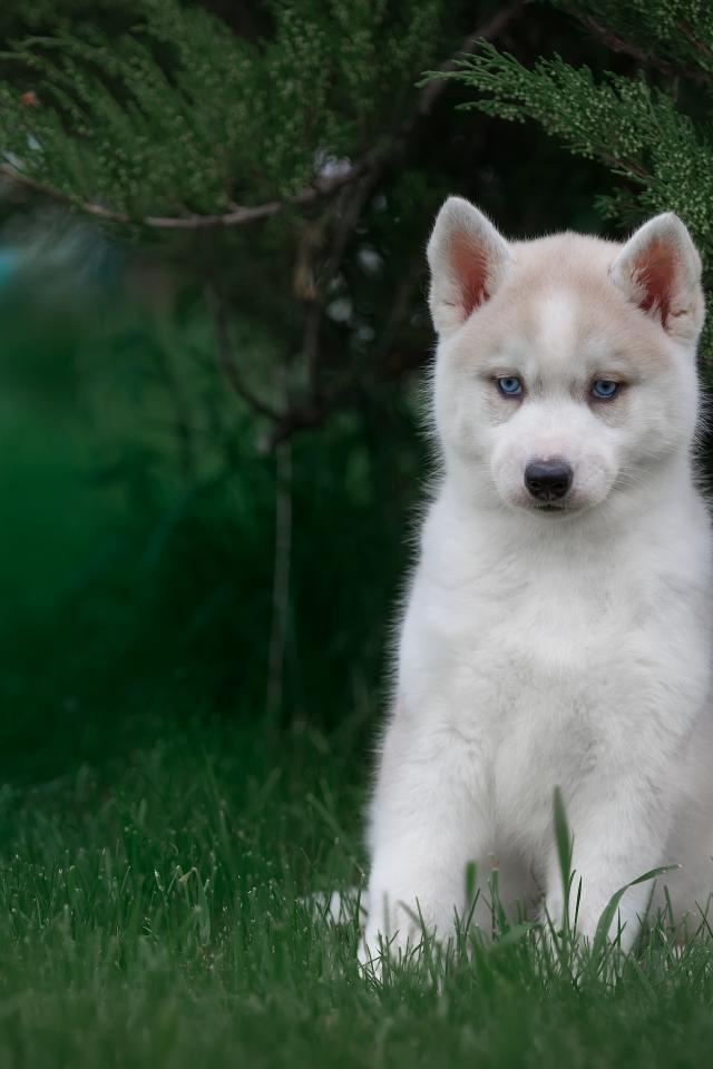 Обои Милый голубоглазый щенок хаски в зеленой траве
