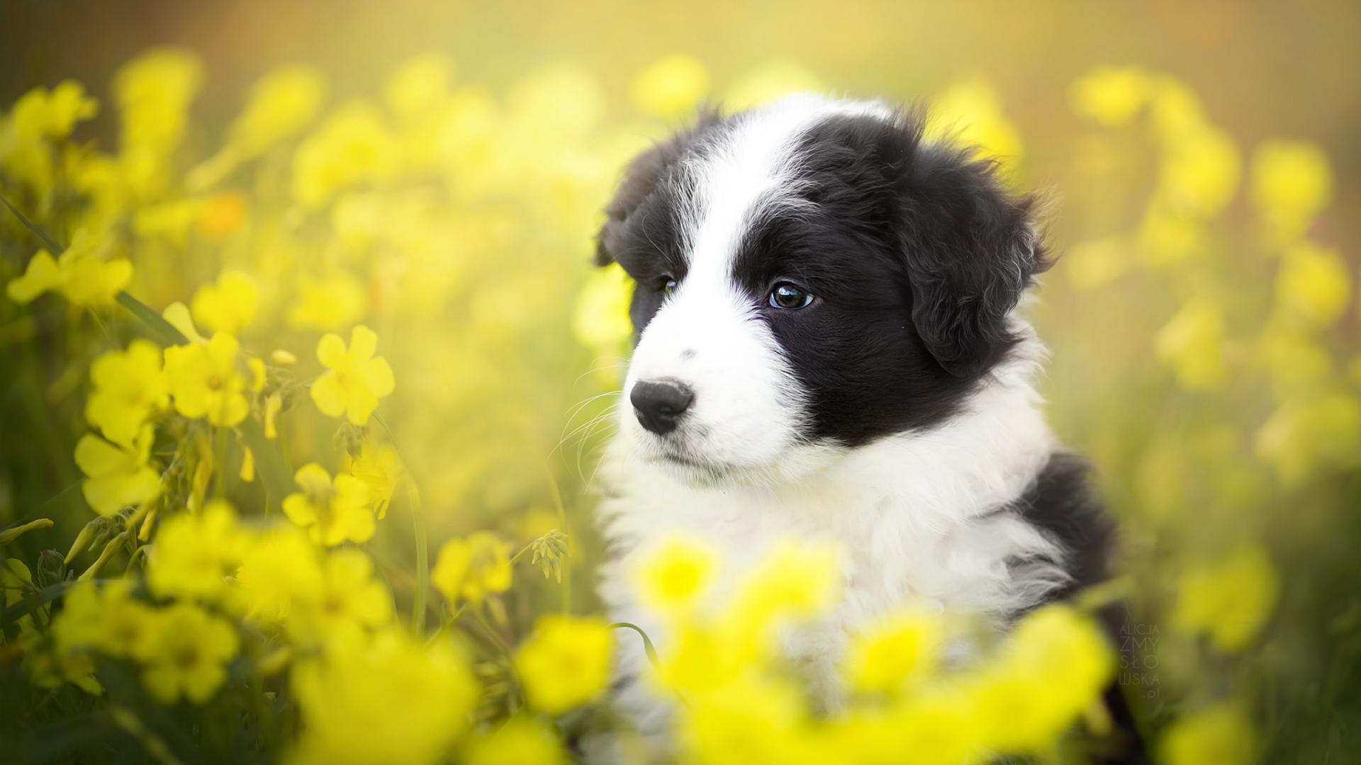 Обои Щенок породы бордер-колли сидит в желтых цветах