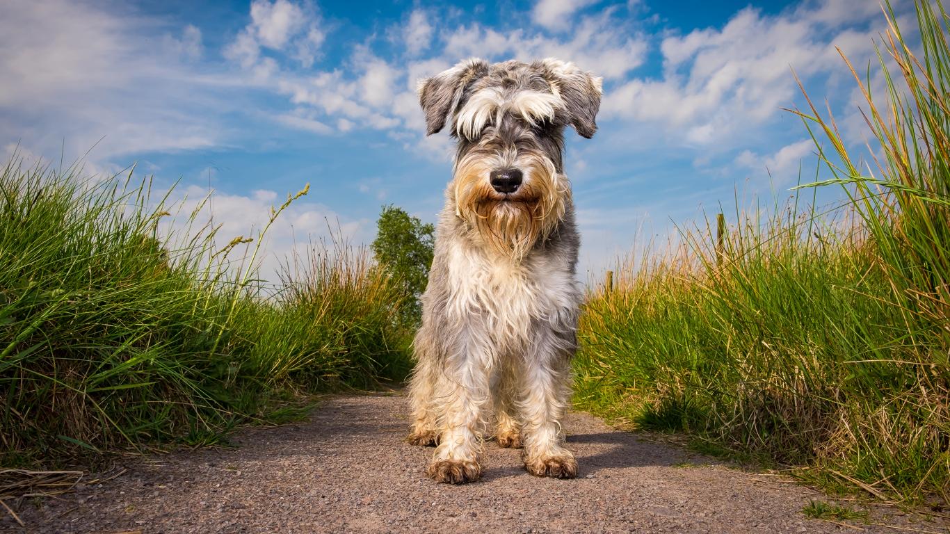 Обои Маленькая собака породы шнауцер на фоне неба