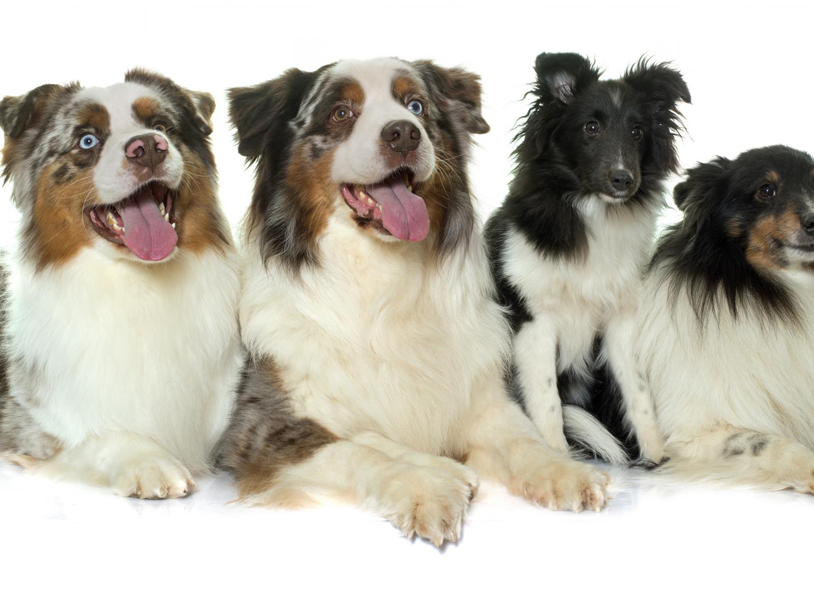 Обои Четыре собаки породы Австралийская овчарка на белом фоне