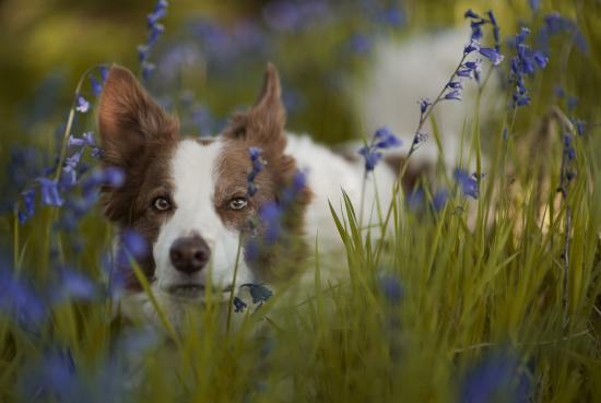 Обои Собака породы бордер-колли лежит в синих полевых цветах