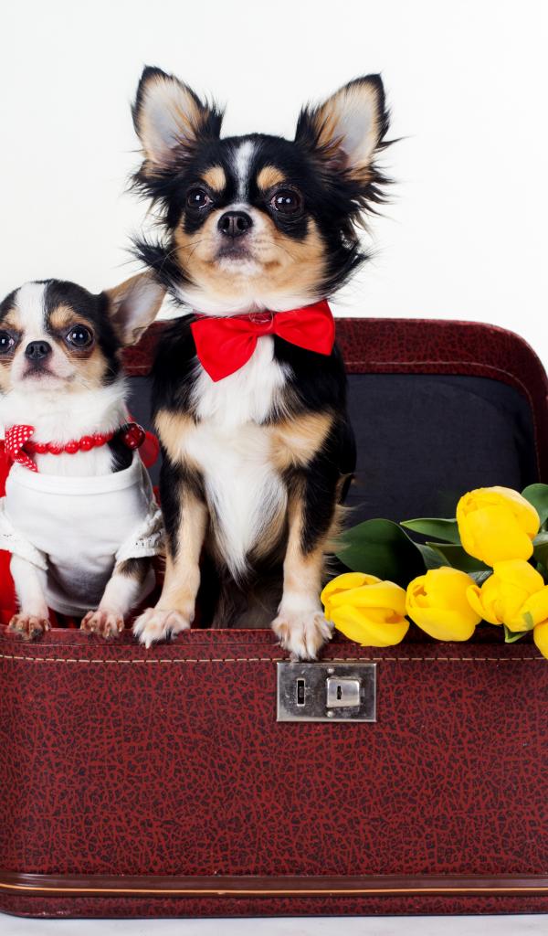 Обои Чихуахуа сидят в чемодане с тюльпанами